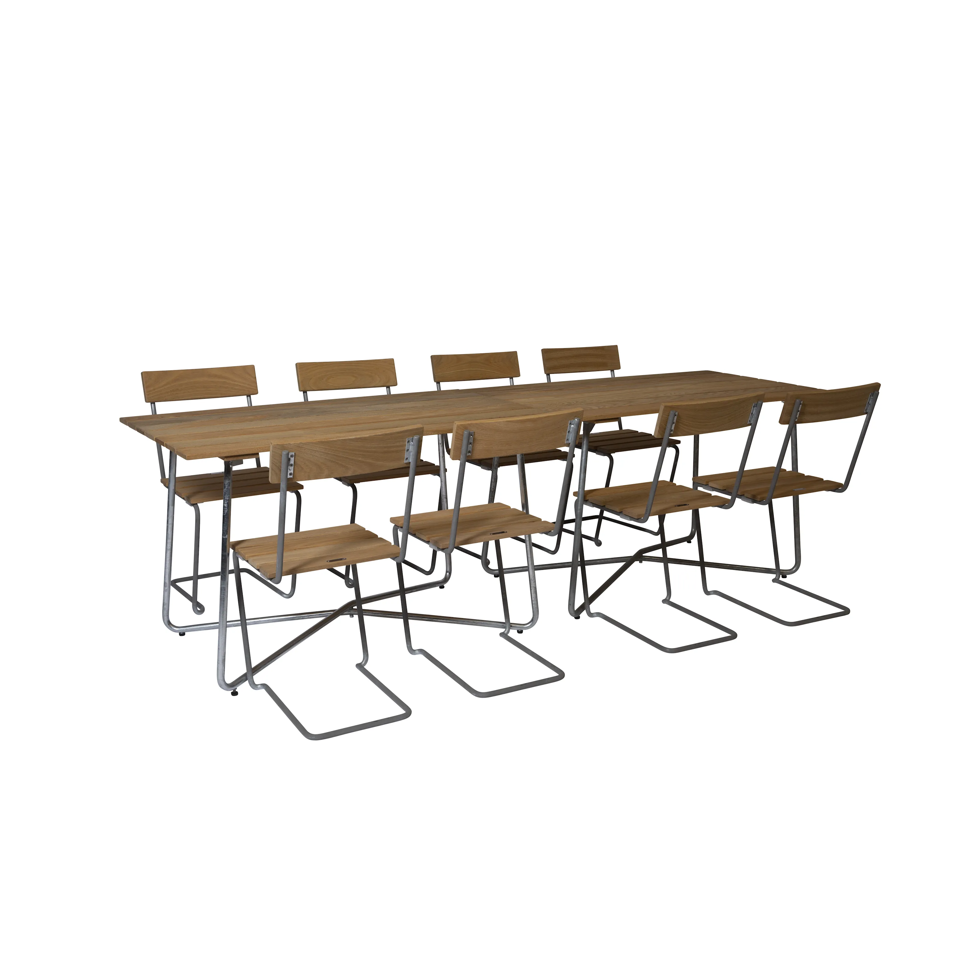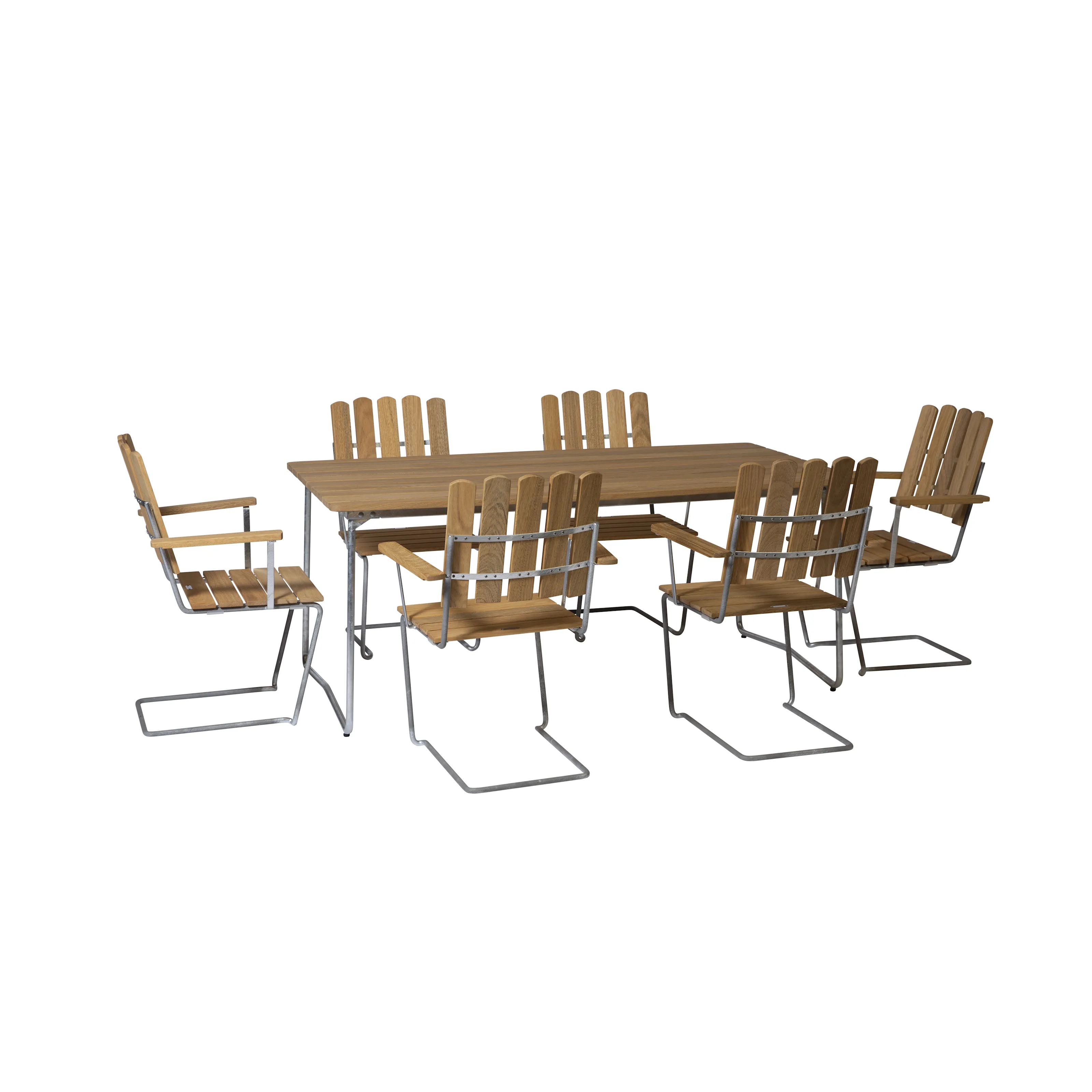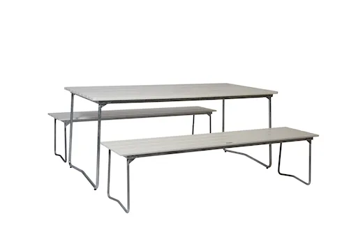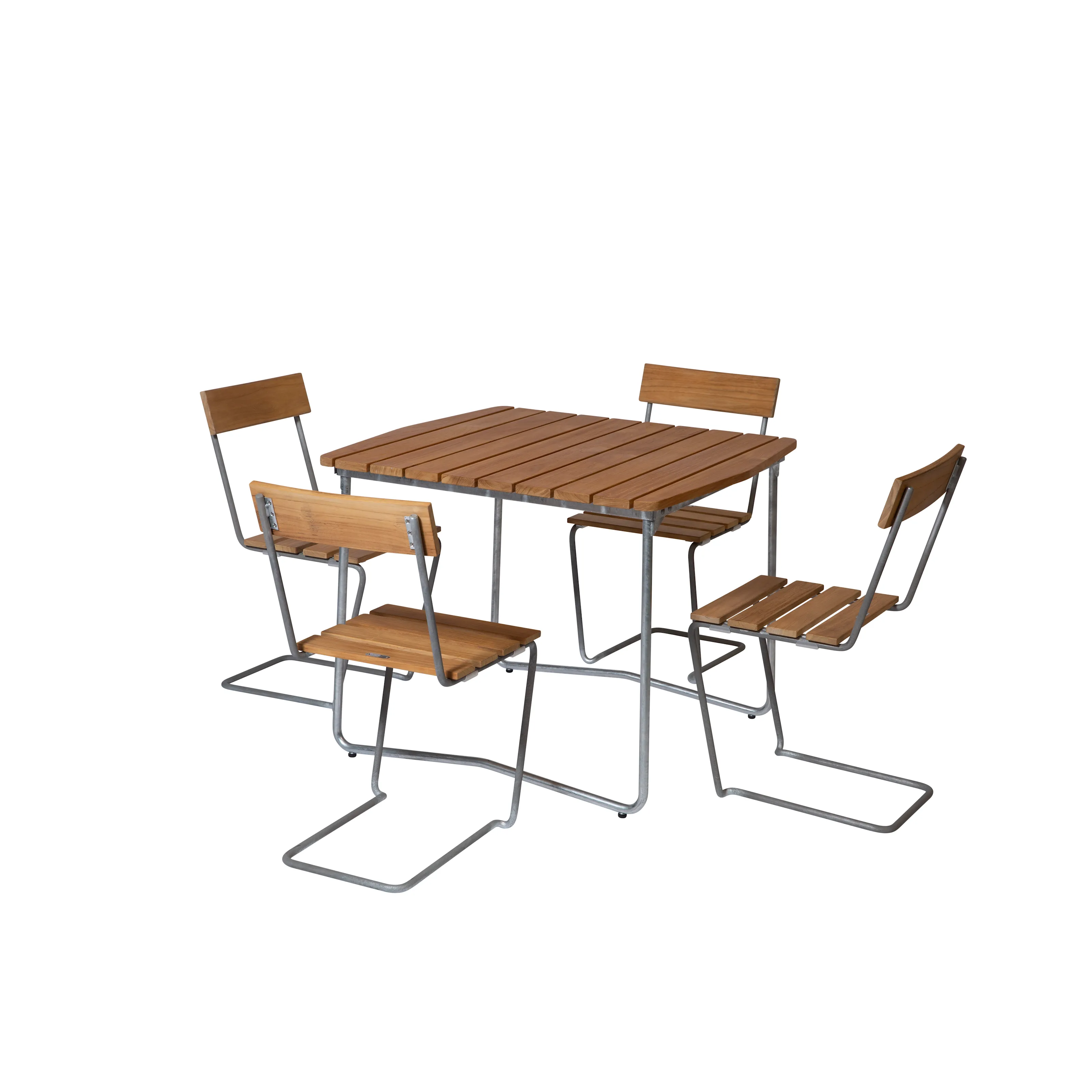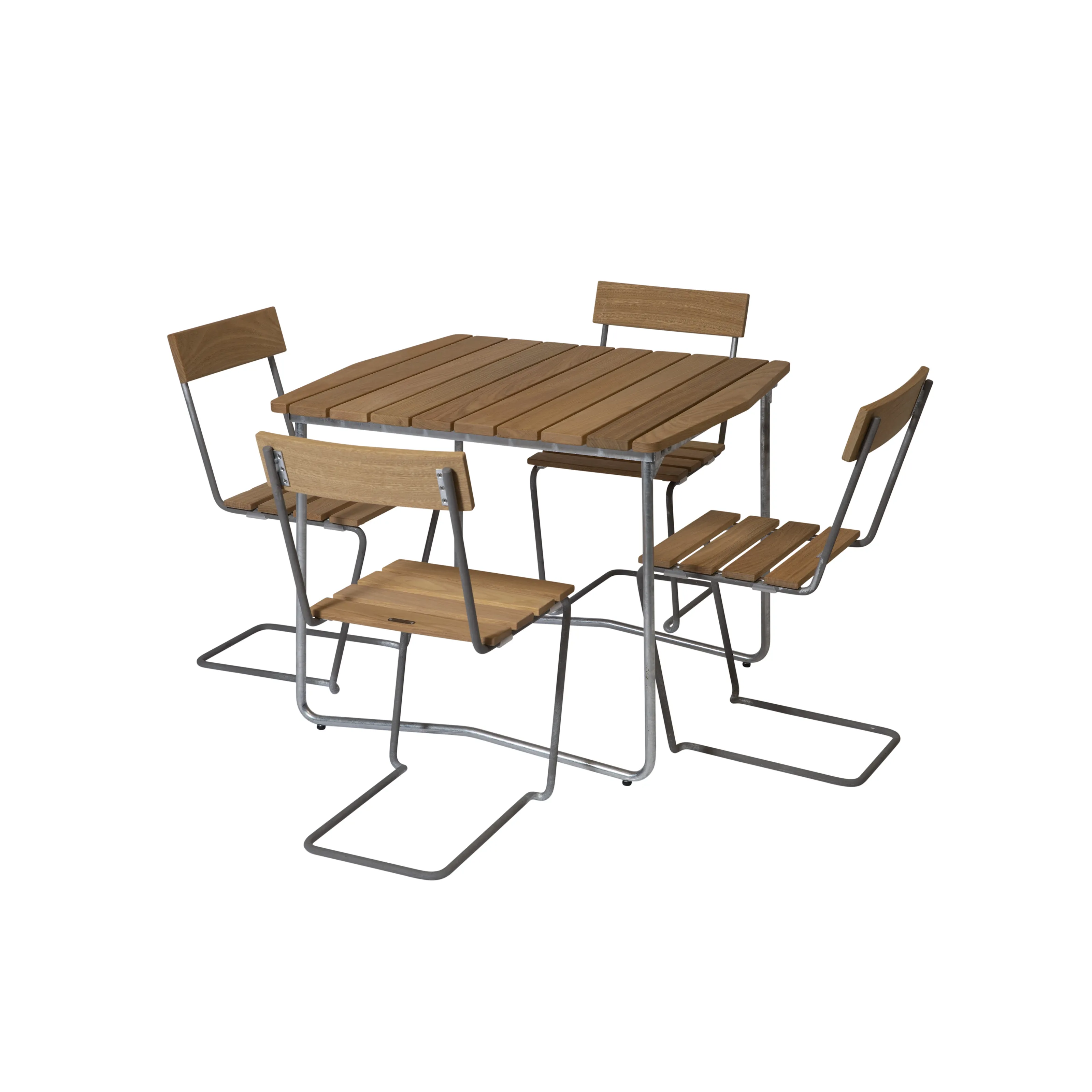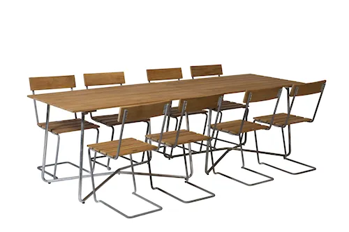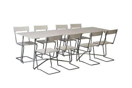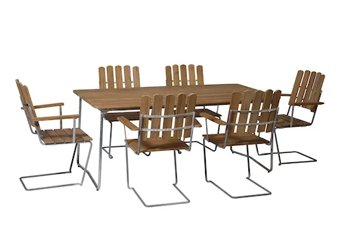Våra matgrupper för utomhusbruk tillverkas i slitstarka material som är noggrant utvalda för att tåla både tidens tand och det nordiska klimatets skiftningar. Med stativ i varmförzinkat eller pulverlackerat stål och träslag som ek, teak och svensk furu får du utemöbler som inte bara är vackra att se på – utan som också står emot väder, vind och daglig användning. Trädetaljerna utvecklar med tiden en naturlig patina som gör varje matgrupp unik och ännu vackrare år efter år.